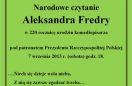 „Zemsta”, „Śluby panieńskie”, „Paweł i Gaweł”. Któż nie zna i nie lubi humoru Aleksandra Fredry, mistrza ciętej riposty? A że w tym roku przypada 220 rocznica jego urodzin, więc warto uczcić jubileusz czytając utwory komediopisarza. Druga edycja „Narodowego Czytania” to ku temu doskonała okazja, gdyż w całym regionie zaplanowano mnóstwo atrakcji. W Odrzykoniu fragmenty z Fredry będzie czytał sam pomysłodawca akcji - prezydent Bronisław Komorowski.