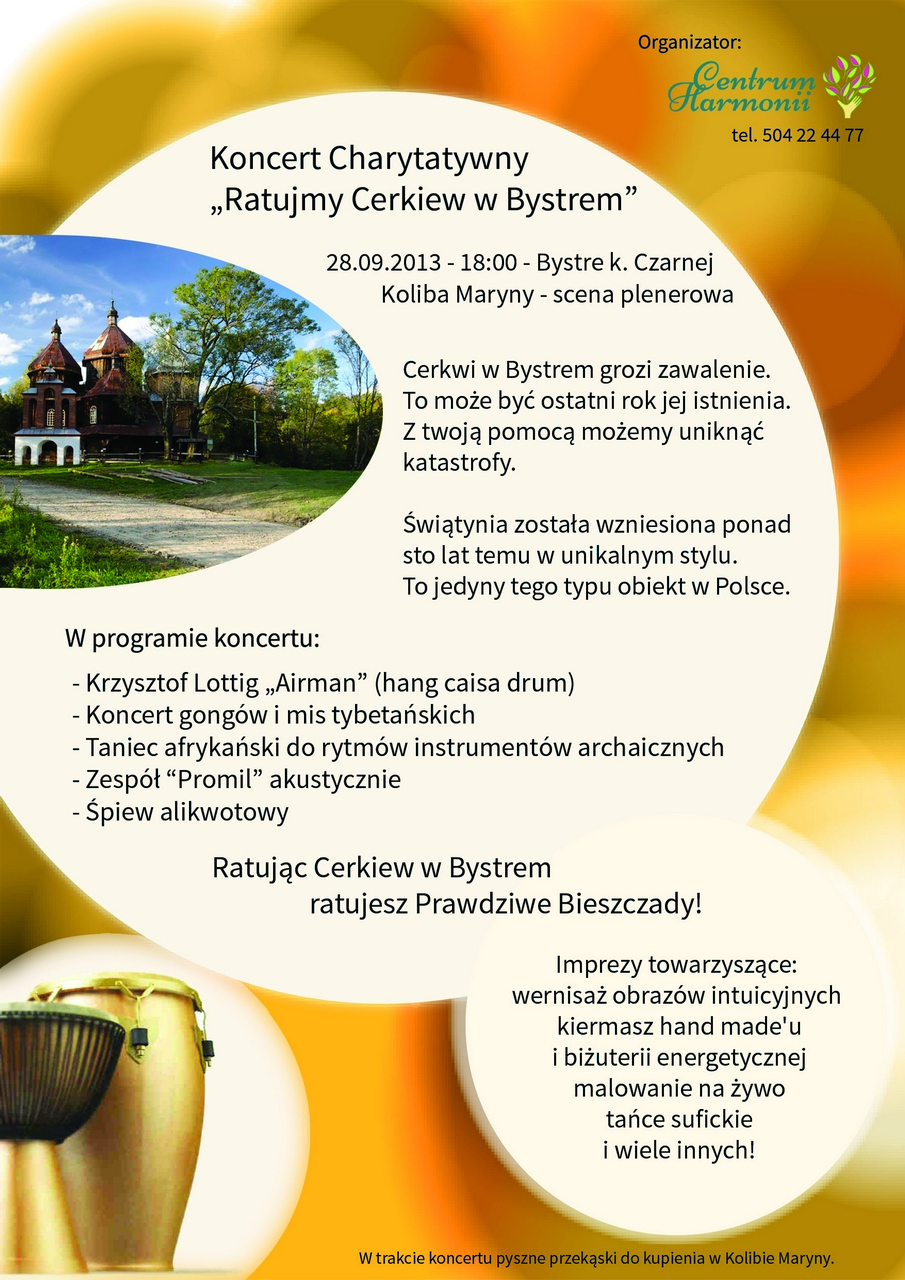 Koncert na rzecz ratowania cerkwi w Bystrem  odbędzie się 28 września o godzinie 18:00 pod cerkwią w Bystrem. Jak zapewniają organizatorzy - ludzie dobrej woli, będzie refleksyjnie i bardzo energetyczne.