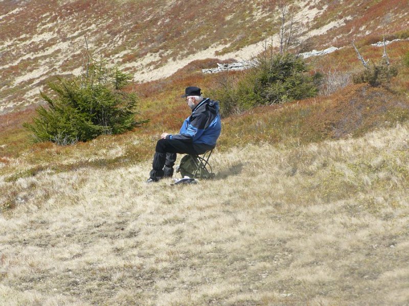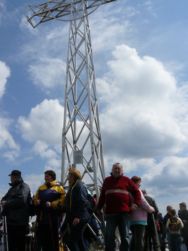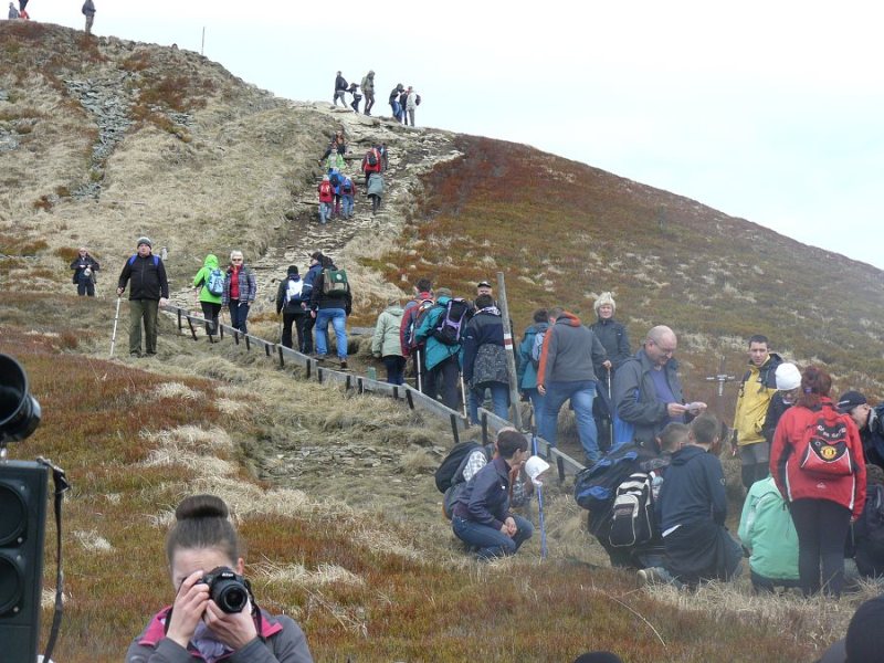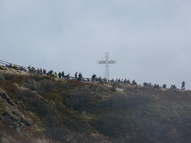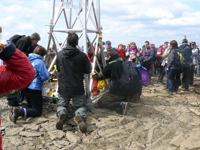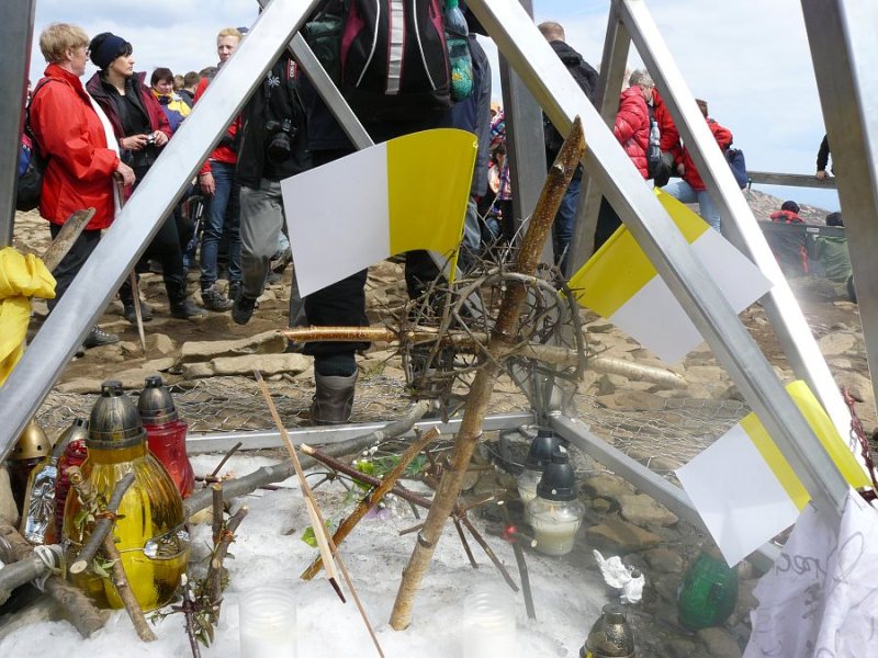 Na szczycie reprezentowane były bodaj wszystkie  strony Podkarpacia. Tuż po nas przyszła pielgrzymka rzeszowskich podhalańczyków z ks. dr. Sebastianem Piekarskim z parafii garnizonowej. Jak zwykle, ruch wokół krzyża, posiłek, pamiątkowe zdjęcia… A na mnie największe wrażenie zrobili pielgrzymi, którzy nie poddali się temu rozgardiaszowi, tylko dotykając krzyża, żarliwie się modlili. U stóp  umieszczono znicze, chorągiewki… Znów będzie się wkurzać straż parkowa i działacze PTTK, którzy uważają to za śmiecenie. Jak mi  kiedyś tłumaczyli, ktoś ( czyt. oni) musi później to wszystko sprzątnąć i znieść na dół.