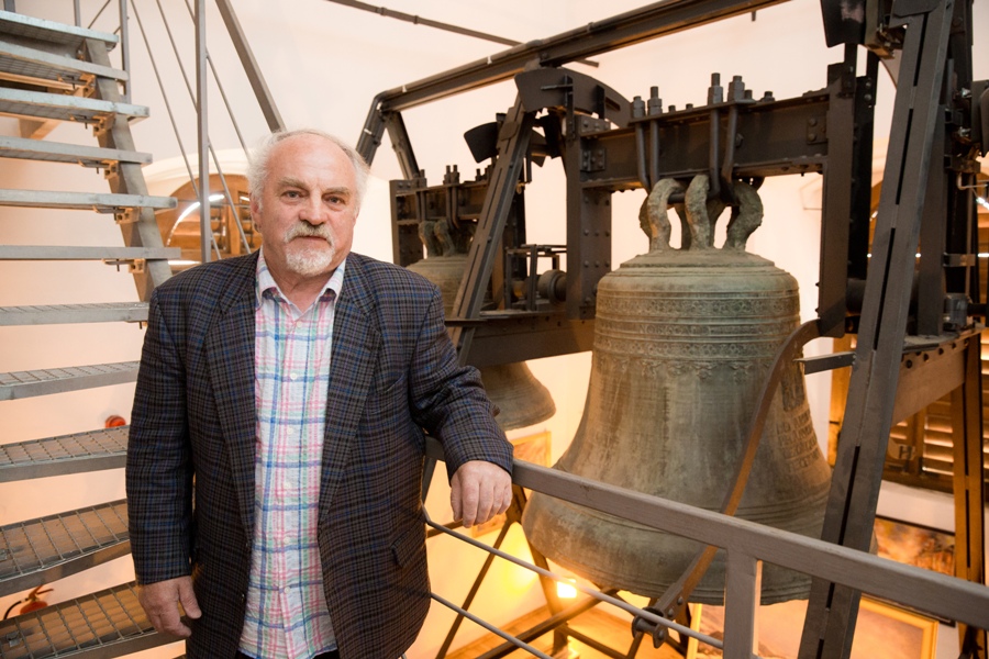 Zdzisław Gil, krośnieński artysta-konserwator dzieł sztuki przed odnowionymi dzwonami. Fot. Tadeusz Poźniak
