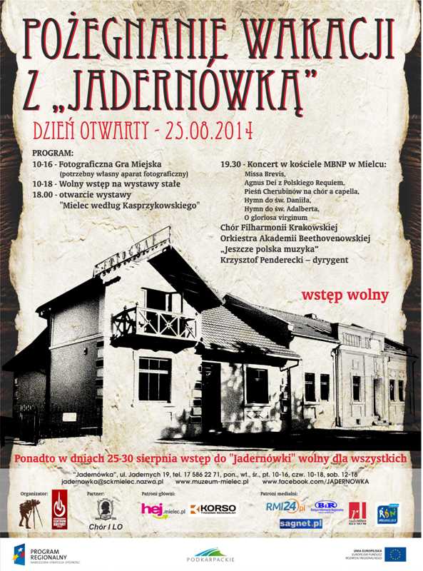W najbliższy poniedziałek Jadernówka Oddział Fotograficzny Muzeum Regionalnego w Mielcu zaprasza na Dzień Otwarty - Pożegnanie Wakacji. W programie między innymi Fotograficzna Gra Miejska, otwarcie nowej wystawy, a zwieńczeniem całości będzie koncert w kościele MBNP.