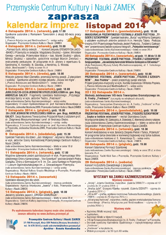Listopad w Przemyskim Centrum Kultury i Nauki ZAMEK upłynie pod znakiem poezji, doskonałej muzyki, malarstwa, kultury japońskiej i teatru. Z recitalem wystąpi Stanisław Soyka, zaśpiewa też Mela Koteluk, a miłośnicy teatru będą mieli okazję zobaczyć „Burzę” wg Williama Szekspira.