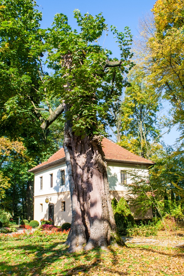 Przed dworem ocalały resztki starodrzewu – pamiątka po dawnych właścicielach. To park drzew rodzimych: dębów, grabów, klonów, jesionów, wierzb. I nie tylko rodzimych: np. osiemdziesięcioletni, pochodzący z Ameryki tulipanowiec, posadzony został w latach 30-tych ubiegłego wieku. Jest kasztan jadalny zasadzony przed wojną przez Włocha. Są resztki alei lipowej, troskliwie uzupełnione przez Krzysztofa Pendereckiego. Do grobu Socyna prowadzi alejka grabowa. Przed dworem zachował się wiekowy klon, którego wygląd pokazuje upadek i odrodzenie tego miejsca. W dolnej części drzewo jest spróchniałe, z uschniętymi konarami i ubytkami wypełnionymi specjalną masą. W górnych partiach klon wystrzela w górę młodymi, pokrytymi świeżym listowiem gałęziami.