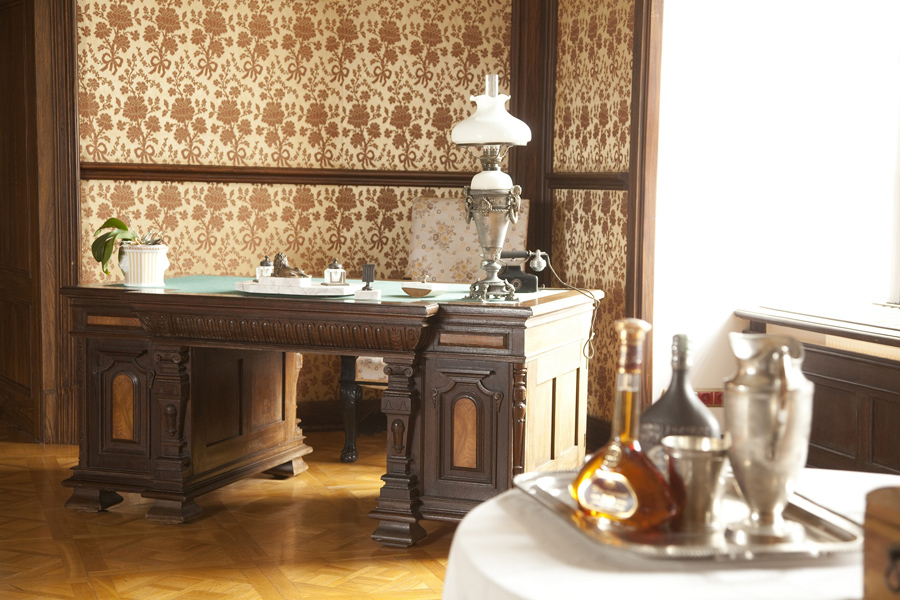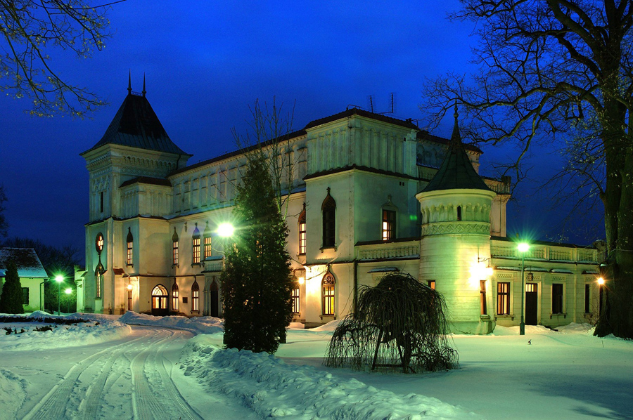 Z klatki schodowej otwiera się amfilada wnętrz parteru. Sala Portretowa z wizerunkami członków rodu, z drewnianą neogotycką boazerią, za którą ukryte jest dyskretne (omijające główną klatkę schodową) przejście na piętro. Za nią sale: Herbowa i Kominkowa pełniące rolę eleganckiej jadalni i pokoju klubowego. Drewniana klatka schodowa prowadzi na drugą kondygnację. To reprezentacyjne piano nobile, gdzie mieści się słynna Komnata Mikołaja Reya. Ozdabia ją ciężki kasetonowy strop i neorenesansowe boazerie zdobione cytatami z pism „ojca języka polskiego”. Czterowiersze brzmią bardzo współcześnie. Na przykład: