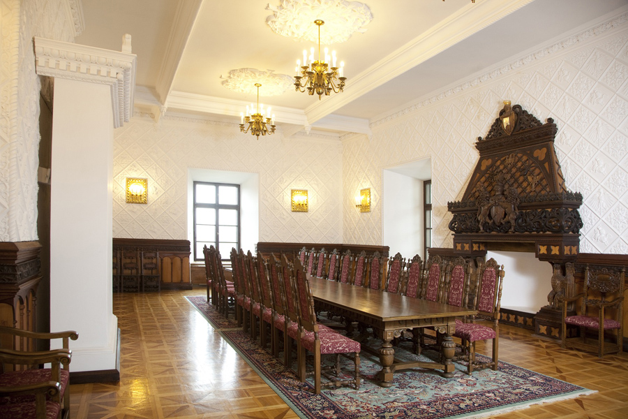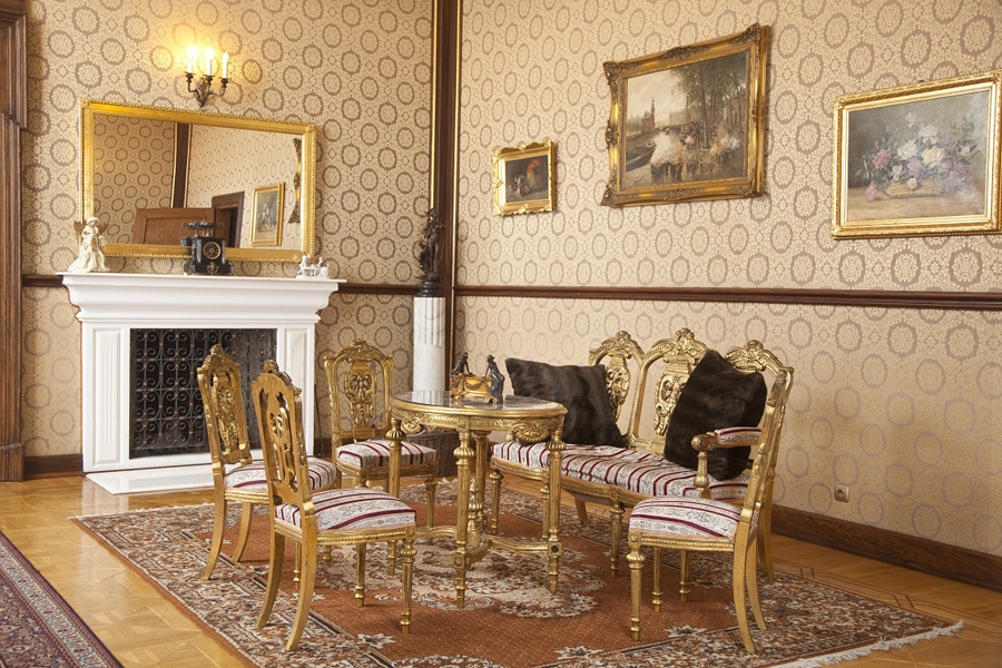 Wnętrze jest prawie puste: neorenesansowy stół i krzesła z rzeźbionymi zapleckami, na których widnieje stylizowany orzeł. Dawni właściciele upodobali sobie włoski renesans, przypominający im podróże po Italii. Sufit kolejnego salonu zdobi kopia „Stworzenia Adama” Michała Anioła z Kaplicy Sykstyńskiej. W dawnej kaplicy odtworzono malowidła pompejańskie i fresk „Tryumf Galatei” według Rafaela. Amfiladę piętra zamyka Sala Królewska (Polska) zwana tak od stiukowej dekoracji ścian z jagiellońskim Orłem i litewską Pogonią. Drewniana dekoracja kominka powtarza godła Rzeczpospolitej Obojga Narodów, dodając do nich trzecie. To anioł: symbol Rusi. Poniżej herb właścicieli Oksza - topór.