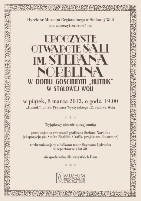 W piątek, 8 marca, zostanie tu zaprezentowana ekspozycja „Stefan Norblin. Grafik, projektant, ilustrator”,  na której będzie można podziwiać plakaty artysty, zarówno z serii turystycznej, jak i reklamowej oscylujące w stylistyce art déco. Zobaczymy także projekty okładek książek i czasopism, ilustracje czy karykatury. Prześledzenie rozwoju twórczości graficznej artysty pozwoli umiejscowić go w nurcie grafiki lat międzywojennych. Otwarcie sali im. Stefana Norblina uświetni występ Szymona Jędrucha znanego tenora, pochodzącego ze Stalowej Woli, który zaprezentuje się w  repertuarze z lat 30. Każda z pań obecnych na imprezie otrzyma niewielki, ale wyjątkowy upominek.