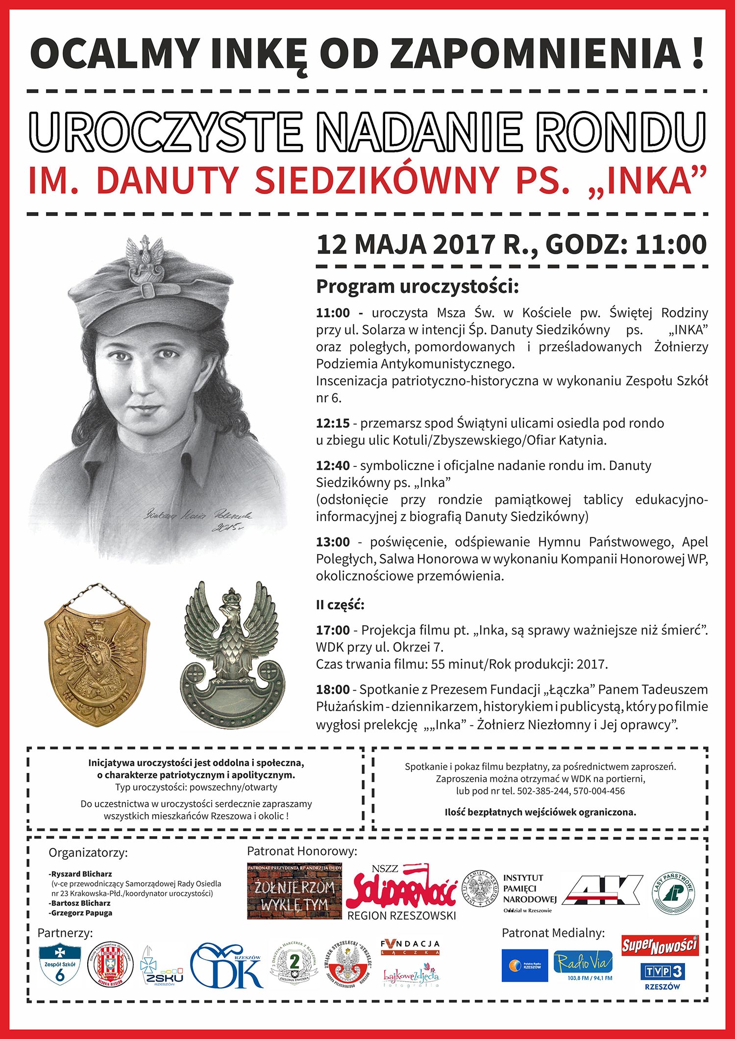Uroczystości rozpoczną się w piątek, 12 maja br. mszą świętą w kościele pw. Świętej Rodziny przy ul. Solarza w intencji śp. Danuty Siedzikówny ps. „Inka” oraz poległych, pomordowanych i prześladowanych Żołnierzy Podziemia Antykomunistycznego. Następnie odbędzie się inscenizacja patriotyczno-historyczna w wykonaniu uczniów Zespołu Szkół nr 6 im. płk. Łukasza Cieplińskiego w Rzeszowie. Przed godz. 13 nastąpi nadanie rondu przy zbiegu ulic Kotuli/Zbyszewskiego/Ofiar Katynia im. Danuty Siedzikówny ps. „Inka”, zostanie też odsłonięcie pamiątkowa tablicy edukacyjno-informacyjna z biografią Danuty Siedzikówny. -