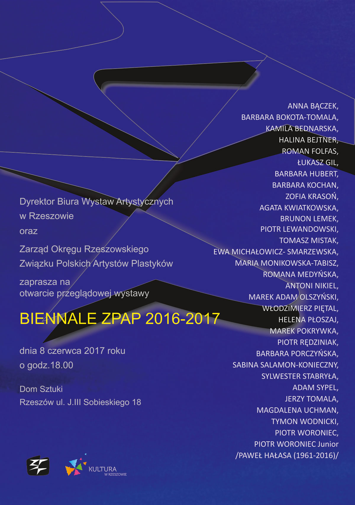 Biennale ZPAP 2016-2017, czyli Przeglądowa Wystawa Członków Okręgu Rzeszowskiego Związku Polskich Artystów Plastyków, to największa i najważniejsza wystawa przygotowywana we współpracy z BWA w Rzeszowie.Jest ona okazją do artystycznej konfrontacji bieżącej twórczej aktywności artystów plastyków zrzeszonych w rzeszowskim Okręgu ZPAP. Reprezentują oni różne środowiska. To pracownicy akademiccy, konserwatorzy i muzealnicy, etatowi pracownicy i działacze instytucji kultury, ale również prowadzący indywidualne działalności jak również wolne zawody. Są mieszkańcami przede wszystkim Rzeszowa, ale również Przemyśla, Jarosławia, Tarnobrzega, Krosna, Ropczyc i wielu okolicznych miejscowości.