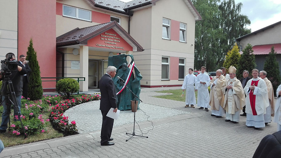To najładniejsza rzeźba, jaką Karol Badyna, prof. krakowskiej ASP wykonał dla Rzeszowa. Postać świętego nie stoi na postumencie, ale na chodniku – jakby witała wszystkich wchodzących do budynku Centrum Integracji Społecznej Rzeszowskiego Towarzystwa Świętego Brata Alberta, przypominając ideę niesienia pomocy potrzebującym. Pomnik został odsłonięty w sobotę, 17 czerwca i poświęcony przez bp. Jana Wątrobę, ordynariusza diecezji rzeszowskiej.