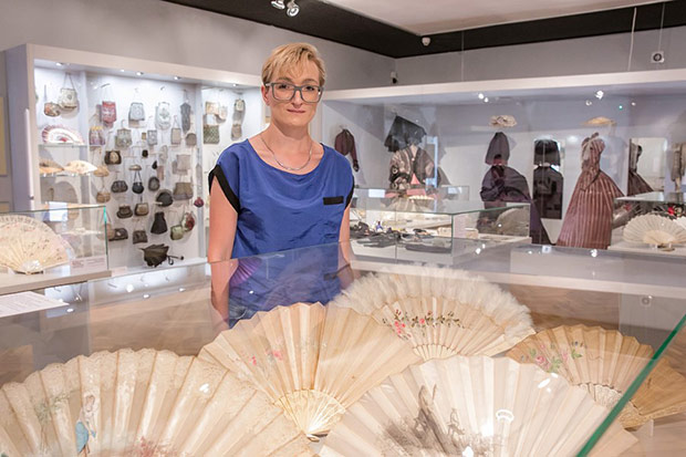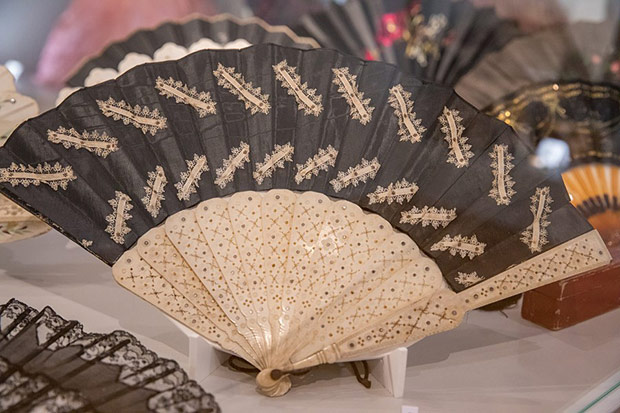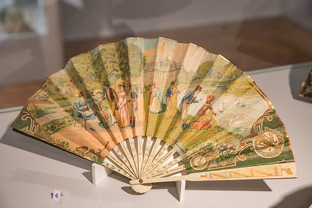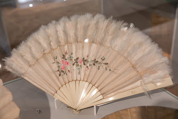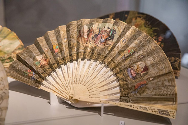 O ile torebka weszła do repertuaru kobiecej mody przy końcu XVIII w. to wachlarz – płaski przedmiot do chłodzenia znany był już w starożytności. Okres wielkiej popularności tego wytwornego przedmiotu przypadł na schyłek XVIII i całe XIX stulecie. Właśnie z tych czasów możemy podziwiać kolekcję wachlarzy europejskich i dalekowschodnich. Wykonane są z rzeźbionych w misterne ażury płytek z kości słoniowej i perłowej macicy, pokrywane jedwabiem, gazą, koronkami igiełkowymi i klockowymi. Malowane na tkaninie czy papierze nawiązują do stylistyki rokoka. Odrębną grupę stanowią wachlarze z piór: strusia, marabuta, pawia i łabędzia.