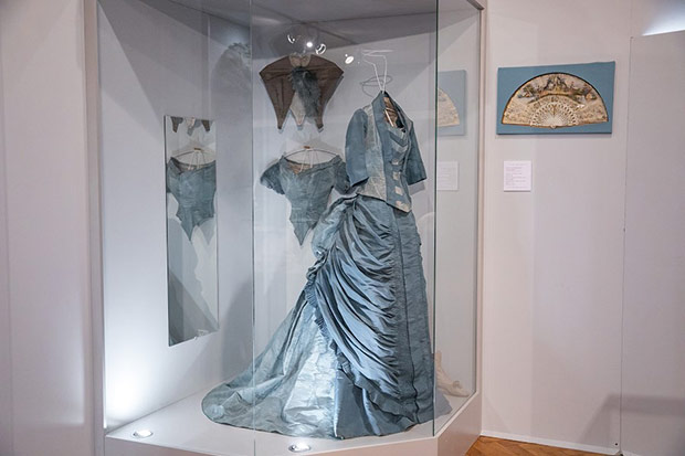 Kreacje z jedwabiu, rypsu, dekorowane gazą, koronkami, haftem stanowią tło dla zakupionych arcydziełek kunsztu kaletniczego, malarskiego, złotniczego. Ubiory uszeregowane zgodnie z chronologią pozwalają prześledzić ewolucję damskiej sylwetki od drugiej połowy XIX w. do międzywojnia, okresu rewolucyjnych zmian w modzie kobiecej. Od krynoliny z różowej tafty z czasów II cesarstwa przechodzimy do toalety uszytej z ciężkiego fioletowego rypsu o spódnicy z tiurniurą ( drapowany tył na poduszce lub stelażu) charakterystycznej dla lat 70-tych XIX w. Następne dziesięciolecie przyniosło architektoniczny, wypiętrzony kształt tiurniury. Ten model z tafty i jedwabnej mory w barwach turkusowych prezentuje toaleta z fantazyjnie uformowaną tiurniurą i dwoma stanikami ( ówczesne suknie były dwuczęściowe): spacerowym z dłuższym stanem i rękawami oraz balowym mocno wydekoltowanym z krótkimi rękawkami z gazy. Bardziej powściągliwa w kształcie suknia z XIX/XX w. nie posiada już tiurniury, lecz wachlarzowato układającą się spódnicę. Dopełnieniem są duże, bogate kapelusze. Cudeńka ze słomki, sztucznych kwiatów, gazy, fularu, aksamitnych i jedwabnych wstążek, bardzo niewygodne bo upinane na wysokich fryzurach mocno ograniczały ruchy. Przechowywano je w walcowatych pudłach służących również do ich transportu . Wystawiono je także z parasolkami i akcesoriami podróżnymi.