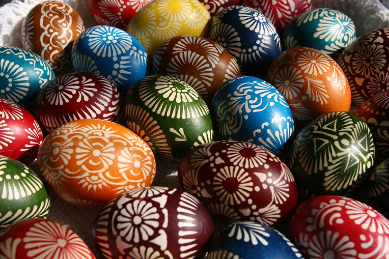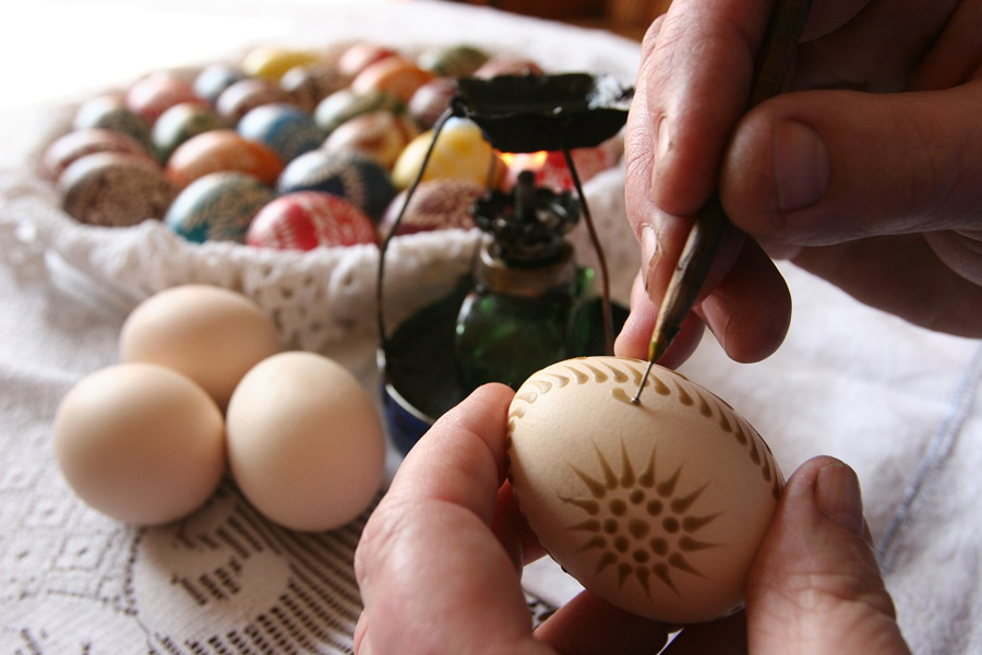 Obyczaj wielkanocnego malowania jajek wywodzi się jeszcze ze starożytności, Słowianom znany był od X wieku. Początkowo jaja zdobiły wyłącznie kobiety (obecność mężczyzn niwelowała magiczne właściwości pisanek), sama czynność była jednym z warunków zachowania ciągłości świata. Dziś wszystkie kolorowe jaja wielkanocne nazywamy pisankami, kiedyś sporządzano jednak rysowanki, skrobanki (jaja kunsztownie rzeźbione), nalepianki i wyklejanki. Niegdysiejsze motywy na skorupkach miały też własną symbolikę. Kolor żółty miał odniesienie do motywów solarnych, zieleń oznaczała wiosenne odrodzenie przyrody i miłość. Szkarłat i biel były oznaką szacunku dla duchów opiekujących się domem.
