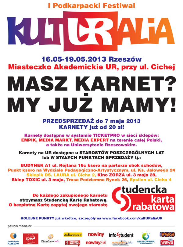 Aż dziewięć dni trwać będzie coroczne majowe święto studentów organizowane przez Samorząd Studentów Uniwersytetu Rzeszowskiego. W tym roku impreza z kojarzonych głównie z koncertami juwenaliów zmieniła formułę na I Podkarpacki Festiwal „KultURalia”. Koncertów, oczywiście, nie zabraknie, ale studenci będą mieć okazję spotkać się również z rozrywką innego rodzaju: w filharmonii, teatrze, galerii i kinie (w niektórych placówkach za darmo!). Będzie też dużo sportu, wymiana książek i tradycyjny barwny korowód.
