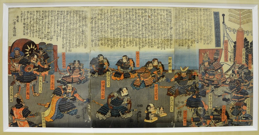 Wśród militariów są dwa miecze: katana – dłuższy z XVII stulecia oraz wakizasi – krótszy (XIX w). Pozbawiony ozdób łuk z drewna pokrytego laką ma długość ponad dwóch metrów. Buzdygan – oznaka godności hetmańskiej różni się od europejskich. Wykonany jest z pokrytego czarną laką drewna z nałożoną listewką w tym samym kolorze. Osobliwością jest bojowy wachlarz (w Japonii używały go zarówno kobiety jak i mężczyźni) wykonany z papieru na który nałożono grubą warstwę czarnej laki. Jej powierzchnię zdobią dwa koła: czerwone, a na drugiej stronie złote. To symbole władzy wojskowej.