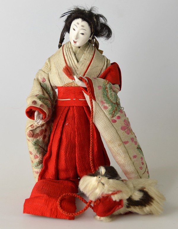 Lalka porcelanowa, japońska, siedzącego samuraja z okresu Edo (1850-1868). Lalka przedstawia postać młodego samuraja, ubranego w uroczyste kimono. Samuraj ma miecz typu katana. Lalka posiada naturalne włosy. Fot. Łukasz Kyc/Muzeum Podkarpackie w Krośnie