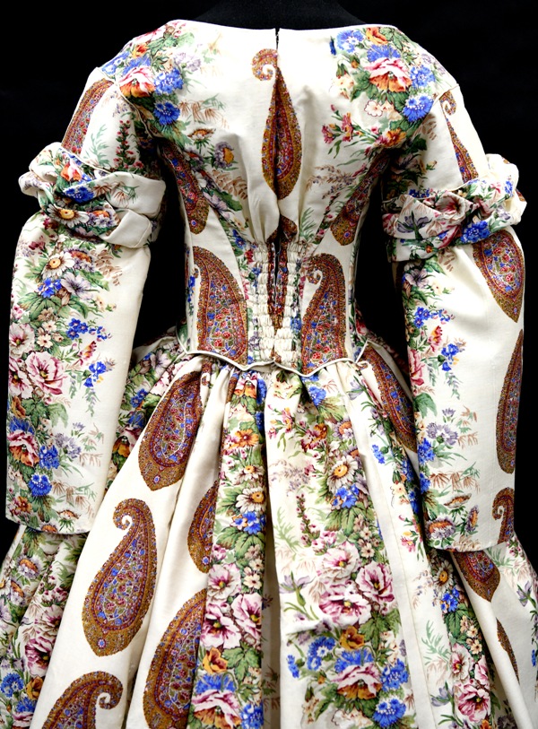 Trudno określić czy kaszmirowo-jedwabną kreację uszyto w kraju, czy może przywieziono ją z zagranicznych wojaży. Tkanina mogła zostać wyprodukowana w Anglii. Brytyjskie manufaktury słynące z doskonale drukowanych materiałów zatrudniały cenionych rysowników. Wzory początkowo subtelne, monochromatyczne wraz z doskonaleniem technik drukarstwa i farbiarstwa w XIX w. ewoluowały ku dekoracjom rozbudowanym kompozycyjnie i zróżnicowanym kolorystycznie. Przykładem tych ostatnich może być omawiana tkanina, w której zestawiono realistycznie potraktowane studia rodzimych polnych kwiatów z egzotycznym motywem bota rozpowszechnionym w Europie w końcu XVIII w. kiedy zapanowała moda na kaszmirskie szale.