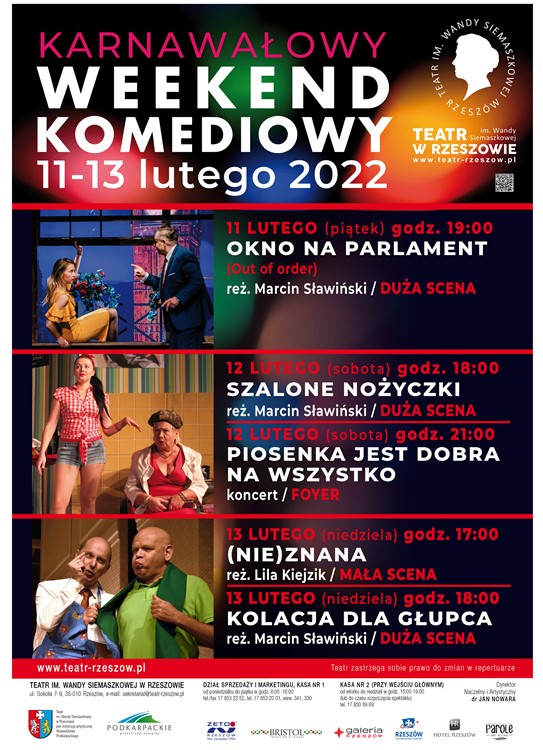 Spośród spektakli rzeszowskich będzie można zobaczyć najpopularniejsze komedie wyreżyserowane przez współpracującego z Rzeszowem od wielu już lat Marcina Sławińskiego: „Szalone nożyczki”, „Kolacja dla głupca” oraz najnowszy (premiera odbyła się w styczniu): „Okno na parlament (Out of order)” angielskiego dramaturga Raya Cooneya, nazywanego królem teatralnej farsy. Jego sztukę w reżyserii Sławińskiego cechuje szalone tempo, barwne postaci i zaskakujące zwroty akcji. Ale nie tylko ta sztuka ma już swoich fanów. „Szalone nożyczki” Teatr Siemaszkowej gra nieprzerwanie od ponad 10 lat. To już blisko 300 przedstawień. Dopełnieniem komediowego weekendu będzie natomiast jedna z najbardziej popularnych komedii światowego teatru „Kolacja dla głupca” Francisa Vebera.