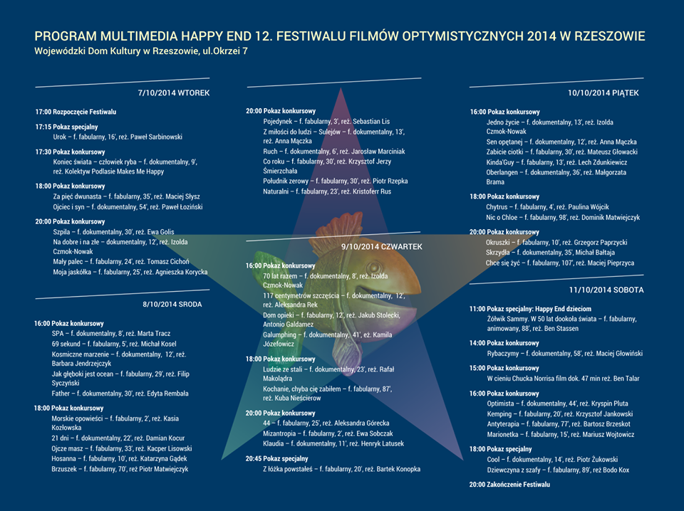 W tym roku widzowie zobaczą kilkadziesiąt filmów optymistycznych - z blisko 200 zgłoszonych filmów organizatorzy festiwalu zakwalifikowali 46 obrazów, w tym 29 fabuł, 23 dokumenty i 4 animacje, które zostaną zaprezentowane w 15 blokach. Spośród filmów konkursowych publiczność wybierze najlepszy, który otrzyma statuetkę Złotą Rybę oraz nagrodę finansową od głównego sponsora festiwalu. Organizatorzy zadbali również o dodatkowe atrakcje. Do soboty będą trwały bezpłatne multiwarsztaty filmowe. Multi, ponieważ codziennie będą obejmować inną tematykę: od historii i języka filmu, poprzez wizaż, fotografię, warsztat aktora, realizację filmu i produkcję. Warsztatowy film będzie powstawał pod okiem Piotra Matwiejczyka.