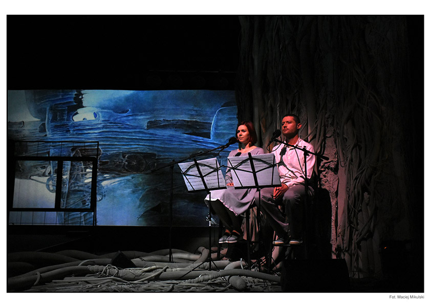 Każdej z dziesięciu scen, na jakie podzielono spektakl, towarzyszy jeden obraz. To subiektywny wybór Jerzego Satanowskiego i jak on sam zastrzega, każdy zapewne dokonałby innego, szukając swojego ulubionego zestawu. Ten dokonany przez reżysera dobrze oddaje różne odcienie sztuki malarza, a czy układa się w przesłanie? Niekoniecznie. To bardziej nastrój niż uchwytne zdanie. Dziwność świata, jakiś smutek, przemijanie. Przedłużeniem świata z obrazów jest prawa strona sceny – plątanina korzeni, a może żył, w której środku tkwi dwójka aktorów – Dagny Cipora i Mateusz Mikoś. Wykonywane przez nich piosenki i recytacje są łącznikiem pomiędzy kolejnymi scenami. Kilka tekstów specjalnie napisał Jan Wołek. Jest poezja Leśmiana, Rilkego, Tymoteusza Karpowicza, Borhesa. Wszystko z muzyką Jerzego Stanowskiego, która wypełnia cały spektakl. Melancholijna, nieco smutna towarzyszy widzowi nieustannie. Beksiński słuchał muzyki przecież godzinami. Im głośniej, tym lepiej. Stale szukał wzmacniacza idealnego.