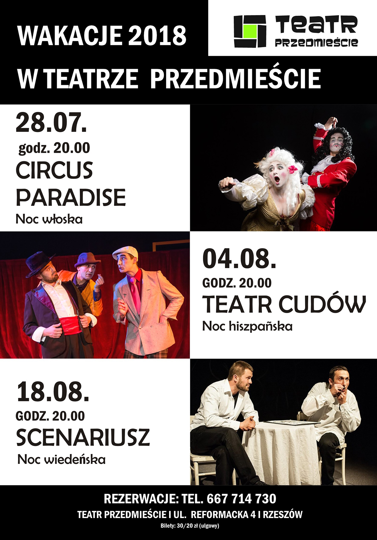 W wakacje rzeszowski Teatr Przedmieście nie próżnuje. W sezonie letnim widzowie śmiało mogą wybrać się na spektakle, a do wyboru mają aż trzy widowiska: „Circus Paradise", „Teatr Cudów" i „Scenariusz".