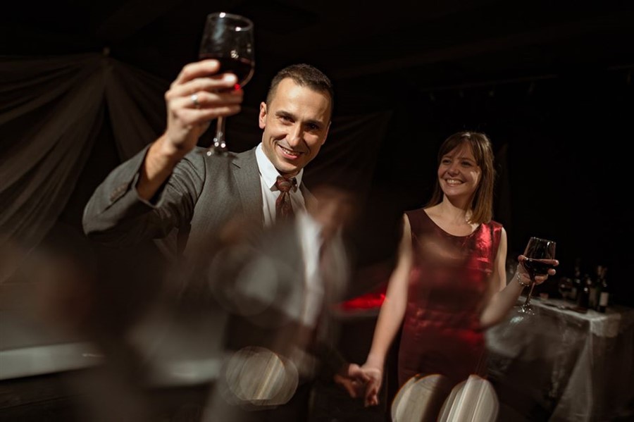 To wszystko nie przysłania jednak głównego, szekspirowskiego tematu. Tempo spektaklu znakomicie trzymane jest w ryzach. Momentami akcja pędzi jakby weselnicy wirowali w szalonej polce, by nagle zwolnić, na jakimś fragmencie dialogu, jakby wychodzili na chwilę z weselnej sali na zewnątrz, by złapać oddech. Na tym „offie” padają ważne zdania, sączy się jad, zacieśniana jest sieć intrygi.