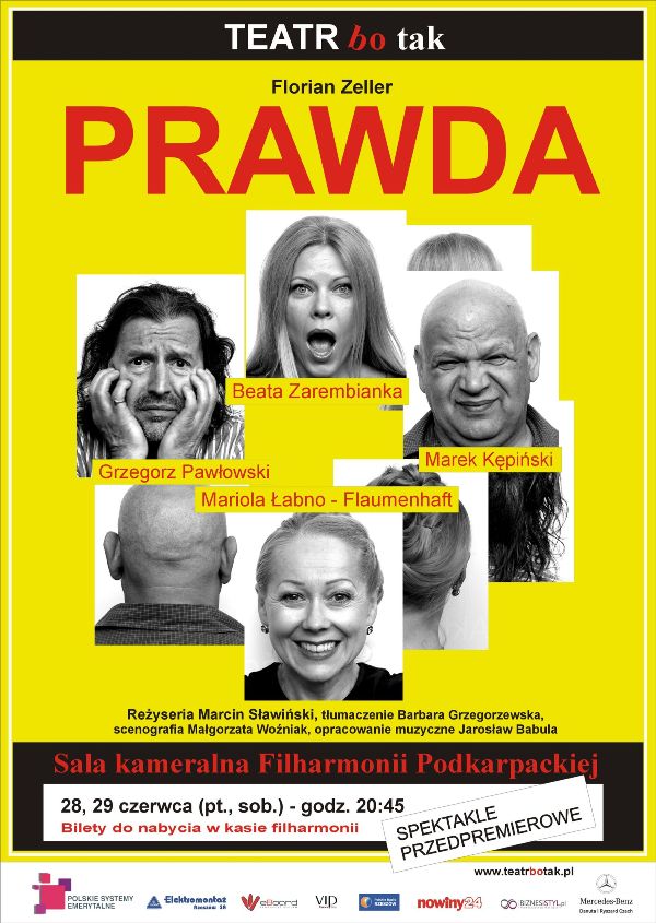 „Prawda” w reżyserii Marcina Sławińskiego w wykonaniu TEATR bo tak, do zobaczenia już 28 i 29  czerwca ( piątek, sobota) o godz. 20.45 na deskach sali kameralnej Filharmonii Podkarpackiej. Bilety w cenie 30 zł do nabycia w kasie Filharmonii Podkarpackiej.