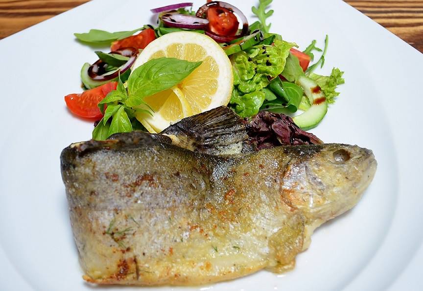 Pieczony pstrąg z jaworca podany z czosnkiem niedźwiedzim i sałatką