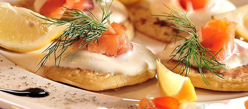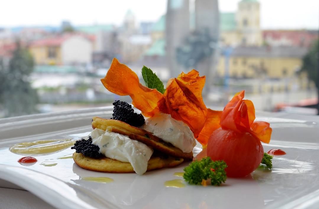 Bliny ziemniaczane z musem serowym dekorowane kawiorem (fot. Wschód Food)