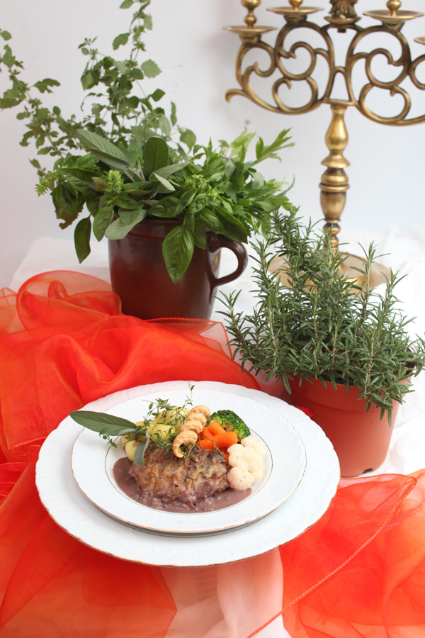 1. Z polędwicy wykrawamy stek. Z wina, octu balsamicznego i szałwi przygotowujemy marynatę. Mięso pozostawiamy w zalewie około godziny.