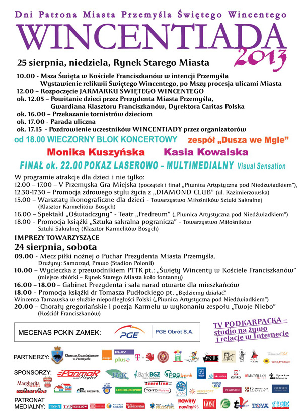 Święty Wincenty, patron Przemyśla, zaprasza w najbliższą niedzielę na swoje wielkie święto. Wincentiada 2013 zapowiada się wyjątkowo atrakcyjnie. W Rynku Starego Miasta na mieszkańców w każdym wieku czeka mnóstwo atrakcji, a wieczorem na scenie zaprezentują się Kasia Kowalskia i Monika Kuszyńska.
