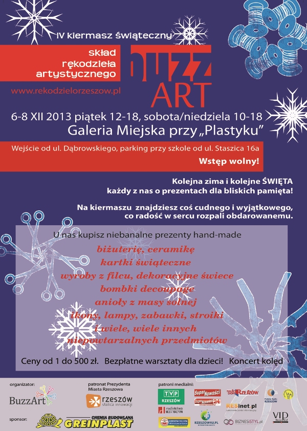 Dotychczas na kiermaszach BuzzArt gościło 180 wystawców i prawie 2 tys. odwiedzających. Także w tym roku na kilkudziesięciu kolorowych stoiskach zobaczymy: scrapbooking, ceramikę, ikony, wyroby z filcu, niespotykaną biżuterię, decoupage - mebelki i dekoracje, designerskie lampy druciane, wyroby szydełkowe, artystyczne kartki świąteczne, tradycyjne hafty krzyżykowe, malunki, rysunki, zabawki dla dzieci, prezenty dla mężczyzn, kartki i  ozdoby bożonarodzeniowe. Kiermasz zapowiada się wyjątkowo. Wstęp na spotkanie z rękodzielnikami będzie bezpłatny, a dzieci i dorośli będą mogli  wziąć udział w niecodziennych warsztatach, jakie towarzyszyć będą kiermaszowi.