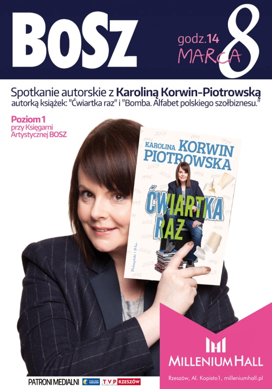 Natomiast w niedzielę o godz. 14.00 w Księgarni Bosz w Millenium Hall gościem spotkania będzie Karolina Korwin-Piotrowska, dziennikarka i autorka książe „Ćwiartka raz” i „Bomba. Alfabet polskiego szołbiznesu”.