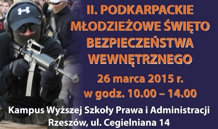 Już po raz drugi Wyższa Szkoła Prawa i Administracji organizuje Podkarpackie Młodzieżowe Święto Bezpieczeństwa Wewnętrznego. Będą pokazy i prezentacja sprzętu służb mundurowych, skoków spadochronowych, pokaz umundurowania różnych formacji, techniki obezwładniania, zatrzymanie pojazdu z niebezpiecznymi przestępcami, oraz warsztaty detektywistyczne, testy sprawnościowe i konkursy. Święto odbędzie się 26 marca, w czwartek, o godzinie 10:00 w kampusie uczelni. Gościem specjalnym będzie Teresa Piotrowska, minister spraw wewnętrznych, a wykład dla uczestników wygłosi prof. Zbigniew Ćwiąkalski, wykładowca WSPiA, były minister sprawiedliwości.