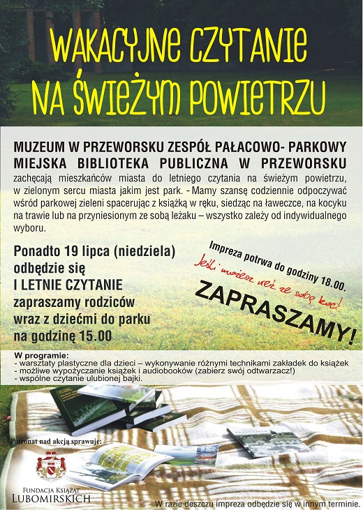 Od początku wakacji, przeworski park stał się miejscem odpoczynku dla mieszkańców tego miasta oraz miejscem, gdzie w spokoju można nadrobić książkowe zaległości. Można zabrać ze sobą kocyk lub leżak, rozłożyć je na trawie i oddać się książkowym przygodom. W Rzeszowie działa już Letnia Czytelnia nad Wisłokiem, gdzie w każdą pogodną wakacyjną sobotę można wymieniać się książkami. W niedzielę w Przeworsku będzie można zapoznać się z najnowszymi pozycjami literatury dziecięcej, jednak nie zabraknie też lektur dla dorosłych.