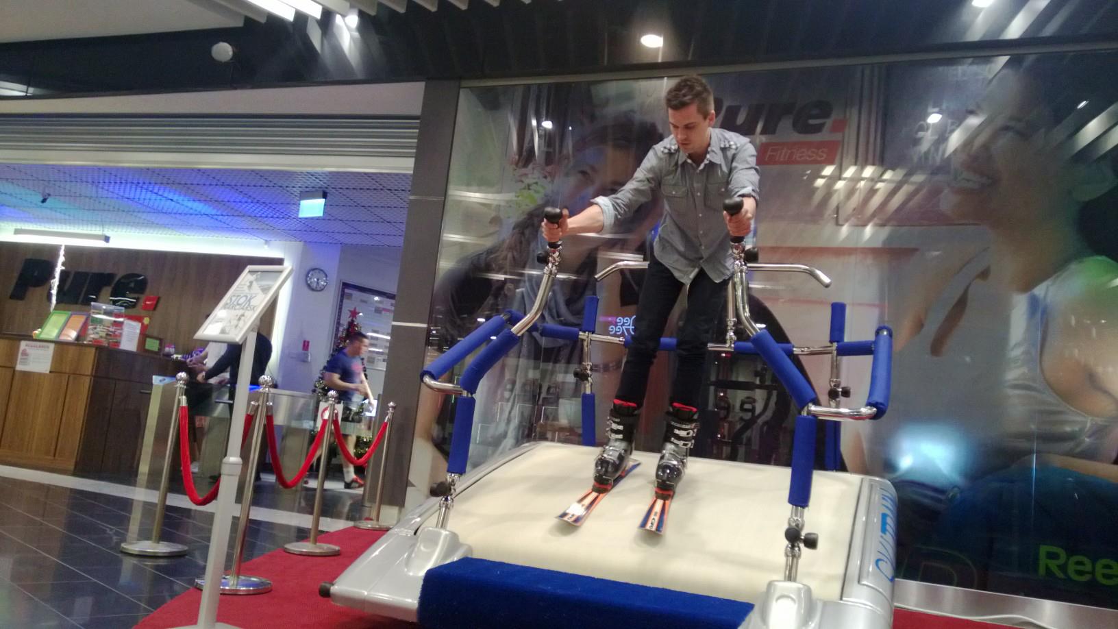 SKITRAIN to unikalne i nowoczesne urządzenie służące do całorocznego treningu jazdy na nartach. Mogą z niego korzystać zarówno dorośli, jak i dzieci. SKITRAIN to konstrukcja, która imituje warunki panujące na stoku. Trenujący wykonuje dowolne ewolucje narciarskie pozostając w miejscu, a tor zjazdowy stoku przesuwa się z możliwością płynnie regulowanej prędkości. Urządzenie stwarza trenującemu warunki zbliżone do rzeczywistych i daje wrażenie prawdziwej jazdy na nartach. Uczestnik ma możliwość kontrolowania i odczytywania podstawowych parametrów jazdy, takich jak prędkość, czas i długość przejechanej trasy. Dzięki temu SKITRAIN jest idealne do treningu i rozgrzewki przed wyjazdem na stok. Urządzenie znajduje się na 2 poziomie Millenium Hall, obok Pure JATOMI Fitness. Profesjonalni trenerzy z klubu fitness chętnie pomogą i wyjaśnią działanie urządzenia. Korzystanie ze SKITRAIN jest bezpłatne, wystarczy wziąć swoje buty narciarskie, bądź skorzystać z tych, które są dostępne na miejscu. Specjalne narty znajdują się przy urządzeniu.