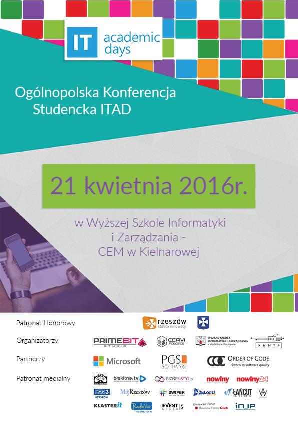 IT Academic Day należy do ogólnopolskiej serii bezpłatnych konferencji informatycznych, odbywających się corocznie w największych miastach Polski. W stolicy Podkarpacia konferencja ta odbywać się będzie po raz piąty i z roku na rok cieszy się coraz większym zainteresowaniem. Ze względu na ogromny sukces wydarzenia w poprzednich latach, to właśnie rzeszowski ITAD zamknie edycję 2015/2016 wszystkich krajowych konferencji IT Academic Day.