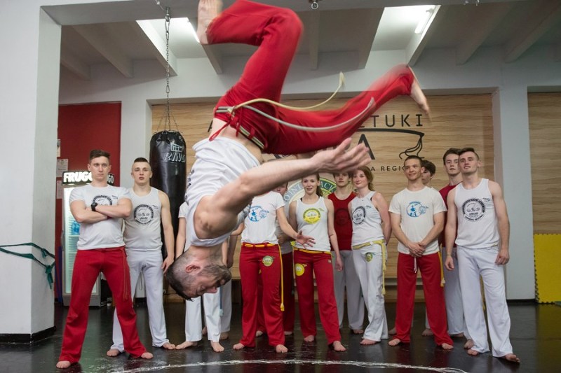 - W Polsce pojawiła się ponad 20 lat temu – mówi Tomasz Majka, instruktor, właściciel Akademii Sztuki Capoeira (ASC) w Rzeszowie. – Pierwszą grupę założył Adam Faba, który zafascynowany tą sztuką walki, sprowadził ją do Polski i trenuje do dzisiaj. Moja przygoda rozpoczęła się 15 lat temu. Byłem licealistą, kiedy wraz z kolegami pojechałem do Szwajcarii do prac sezonowych. Każdy wolny wieczór spędzaliśmy na boisku do koszykówki, gdzie spotykaliśmy się z okoliczną młodzieżą. Było to miejsce, gdzie przychodzili pasjonaci różnych sportów, również osoby trenujące capoeirę. Wtedy nie miałem pojęcia, co to w ogóle jest, ale akrobacje, które wykonywali, były bardzo efektowne. Robili gwiazdy, kopnięcia w powietrzu, uniki, stawali na rękach, na głowach. Początkowo myśleliśmy, że jest to coś w rodzaju tańca. Zachęceni, spróbowaliśmy. Od tamtej pory do zakończenia pobytu w Szwajcarii, ćwiczyliśmy razem z nimi.
