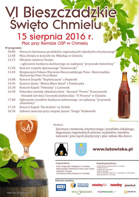 Imprezę rozpocznie otwarcie kiermaszu produktów regionalnych i rękodzieła artystycznego (godz. 10) na placu przy remizie Ochotniczej Straży Pożarnej. Natomiast po mszy św. (godz.12) zostanie ogłoszony konkurs kulinarny na najlepszy przysmak chmielowy. Publiczność zobaczy występy zespołów śpiewaczych i kapeli oraz pokaz warzenia bieszczadzkiego piwa prezentowany przez Bieszczadzką Wytwórnię Piwa Ursa Maior. Będą degustacje regionalnych potraw, wypieków, miodów, nalewek i piw.