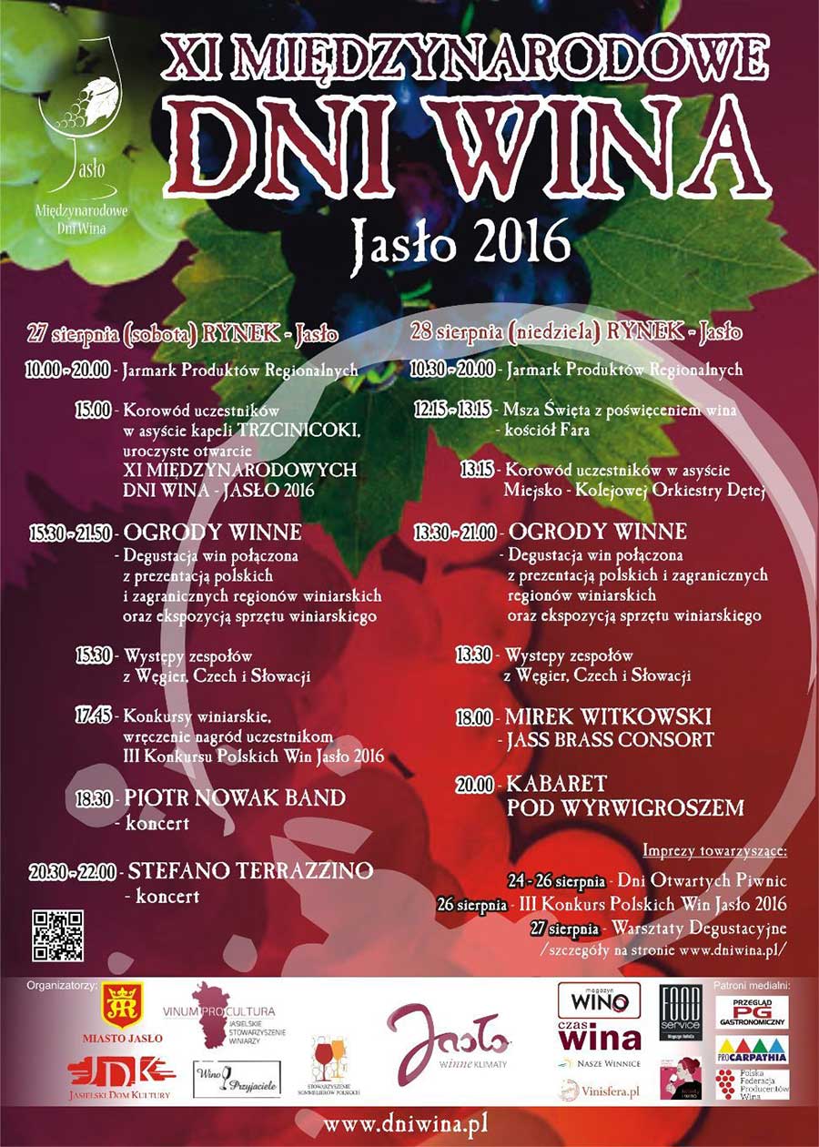 Tradycyjnie, już od 11 lat jasielski rynek zapełnią winiarze, dystrybutorzy win oraz miłośnicy tego trunku z całej Polski i zagranicy. Będą też przedstawiciele firm wytwarzających i sprowadzających wszelkie artykuły oraz urządzenia potrzebne w wielkich i małych winnicach, a przydatne także tym, którzy próbują robić wino domowe. Międzynarodowe Dni Wina to nie tylko rozmowy i degustacje wina, to również muzyczna impreza plenerowa. Wystąpią: Stefano Terrazzino&Belli RiBelli, Kabaret pod Wyrwigroszem, Piotr Nowak Band i Jass Brass Consort z Mirosławem Witkowskim. Międzynarodowym Dniom Wina towarzyszyć będą warsztaty degustacyjne, które poprowadzi Tomasz Kolecki Majewicz, uznany w środowisku sommelier, wielokrotny Mistrz Polski, uczestnik finałów Mistrzostw Europy i Świata Sommelierów.