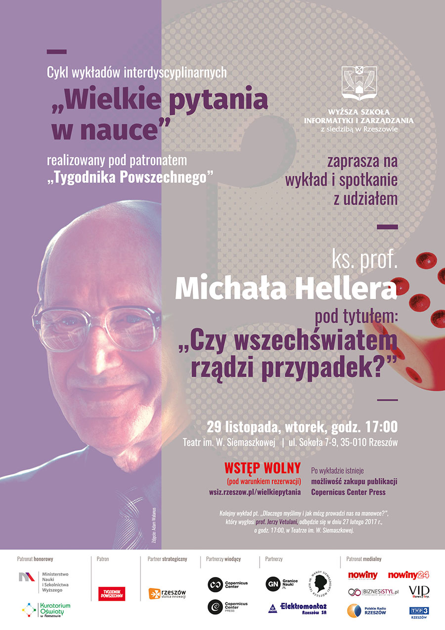 Wyższa Szkoła Informatyki i Zarządzania w Rzeszowie zaprasza na wykład i wyjątkowe spotkanie z udziałem ks. prof. Michała Hellera, laureata Nagrody Templetona, wybitnego kosmologa, filozofa, Profesora Honorowego WSIiZ. Wykład „Czy wszechświatem rządzi przypadek?" odbędzie się 29 listopada br., o godz. 17, w Teatrze im. Wandy Siemaszkowej w Rzeszowie. Spotkanie zainauguruje cykl interdyscyplinarnych wykładów „Wielkie pytania w nauce”, który realizowany będzie pod patronatem Tygodnika Powszechnego.