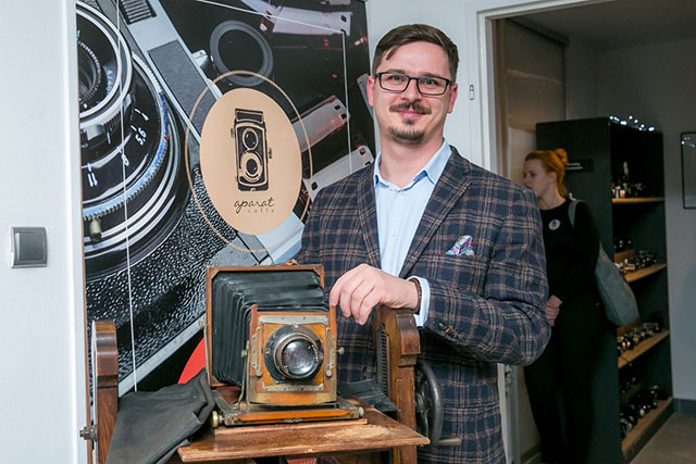 - Kolekcja poszerza się od 10 lat. Zaczęło się od pasji fotografowania i próbowania pracy z różnymi aparatami. Chciałem znaleźć idealny i … jak widać jeszcze nie znalazłem – śmiał się podczas otwarcia Muzeum Aparatów Piotr Mądrzyk, prezes Fundacji Wspierającej Rozwój Kultury „Aparat Caffe”, który już jako dziecka próbował zrobić idealne zdjęcie papieżowi, przejeżdżającemu drogą „oblepioną” wiwatującym tłumem. – Byłem dzieciakiem, ale wiedziałem, jak ważne jest, by w odpowiednim momencie nacisnąć spust migawki i że mam tylko jedną szansę na dobre zdjęcie, bo to było długo przed fotografią cyfrową. Potem pracowałem w zakładzie fotograficznym w Krakowie, gdzie miałem dostęp do studia i ciemni. Próbowałem różnych technik fotograficznych, kupowałem kolejne aparaty. Lubitel 166 był aparatem z Kolekcji, którym miałem okazję wykonać pierwsze zdjęcia oraz poznać technikę wywoływania zdjęć w ciemni. Dość szybko powiększałem swoją kolekcję o nowe modele aparatów m.in. Zorka i Zenit. Taki był początek kolekcji, która w pewnym momencie kolekcja zaczęła rozrastać się w sposób lawinowy. Znajomi zaczęli mi przynosić znalezione gdzieś w szufladach aparaty. Ludzie, u których kupiłem jakiś model, wysyłali mi informacje o kolejnych znaleziskach. Do kolekcji zaczęły trafiać różne unikaty, także aparaty szpiegowskie.