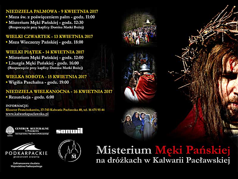 Na Podkarpaciu najbardziej znane jest plenerowe misterium w Kalwarii Pacławskiej, które w tym roku odbędzie się po raz 21. Biorą w nim udział amatorzy, mieszkańcy pobliskich miejscowości począwszy od Kalwarii, aż po Przemyśl, a przygotowania do widowiska zaczynają się kilka miesięcy wcześniej. Misterium rozpocznie się o godz. 12.30 przy kaplicy Domku Matki Bożej, w niedzielę, 9 kwietnia. Drugi raz zostanie wystawione w Wielki Piątek, 14 kwietnia o godz. 12.