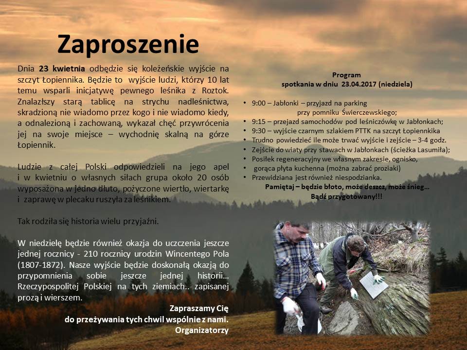 Tegoroczną wyprawą (wyjście czarnym szlakiem PTTK spod leśniczówki w Jabłonkach) uczestnicy chcą uczcić 210. rocznicę urodzin Wincentego Pola, poety, geografa samouka, który dzięki obszernej wiedzy został mianowany profesorem nadzwyczajnym „geografii powszechnej, fizycznej i porównawczej” na Uniwersytecie Jagiellońskim. Wyjście na Łopiennik będzie też okazją do przypomnienia sobie jeszcze jednej historii związanej z tym miejscem.