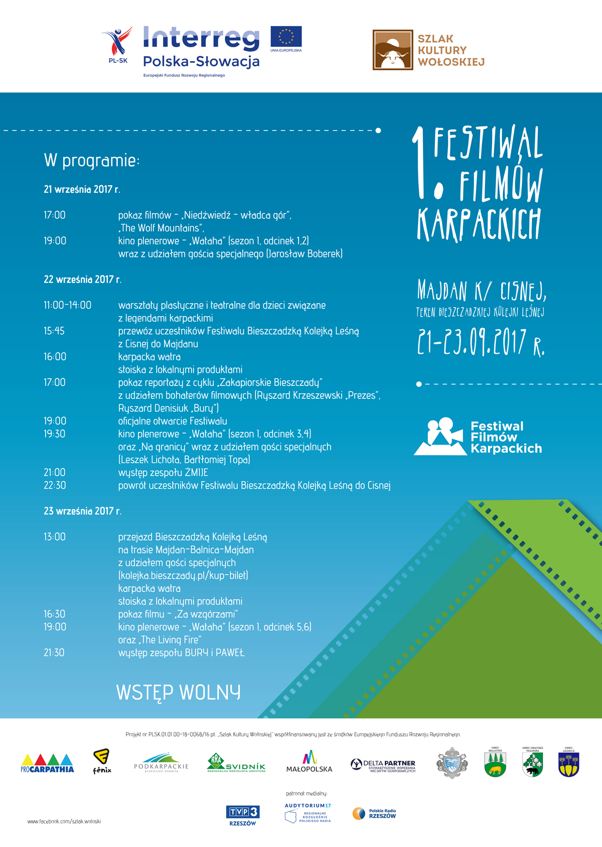 Pokazy filmów związanych z Karpatami, kino plenerowe, a w nim seriale „Wataha” i „Na granicy”, reportaże o bieszczadzkich zakapiorach i przejażdżki Bieszczadzką Kolejką Leśną - w dniach 21-23 września w Majdanie k. Cisnej na terenie kolejki odbędzie się Festiwal Filmów Karpackich.