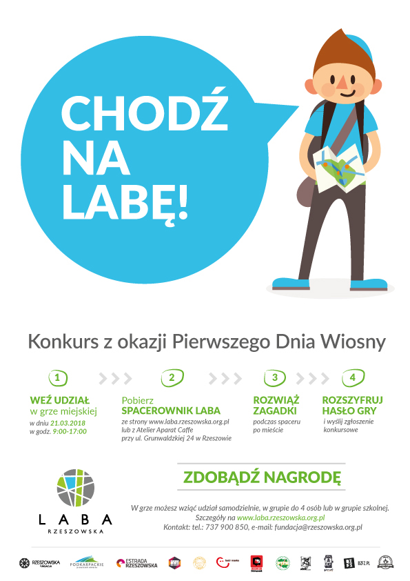 Aby wziąć udział w konkursie, należy 21 marca w godz. 9-17 pójść... na labę, czyli udać się na spacer po Rzeszowie specjalnie wytyczonymi trasami opracowanymi w Spacerownikach LABA. Spacerowniki są dostępne również w Atelier Aparat Caffe przy ul. Grunwaldzkiej 24 w Rzeszowie. Wersja do druku znajduje się na stronie www.laba.rzeszowska.org.pl.