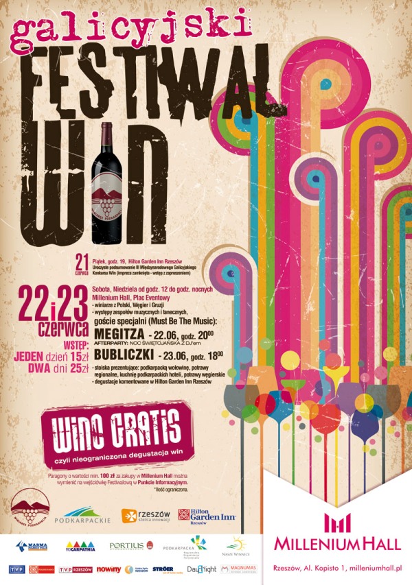 Galicyjski Festiwal Win odbędzie się 22 i 23 czerwca 2013 br.  na placu eventowym Millenium Hall Square. Przestrzeń placu wypełnią domki winiarskie prezentujące wyroby ponad 30 winiarzy z Polski, Węgier i Gruzji. A to oznacza nieograniczoną degustację winiarskich wyrobów. Będzie można skosztować polskich regionalnych potraw, podkarpacką wołowinę oraz dorobek kuchni węgierskiej.