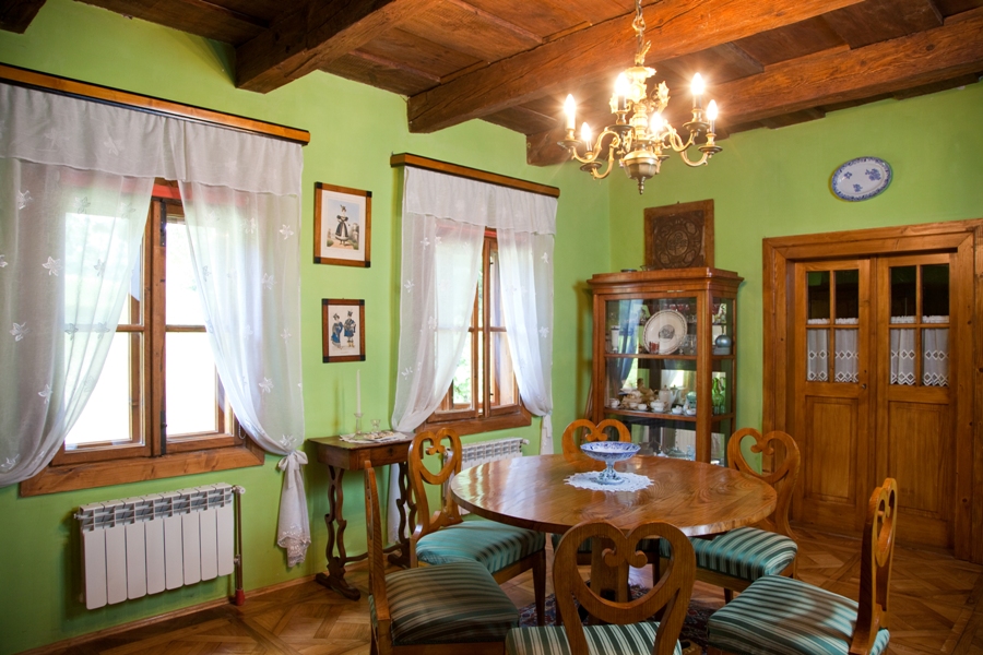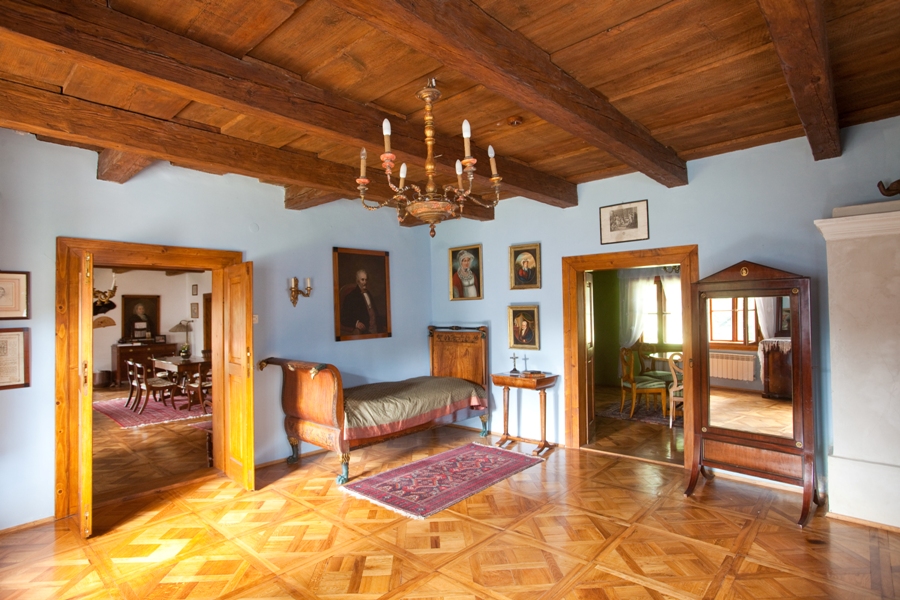 Wchodząc przez zacieniony ganek widzimy amfiladę pokoi, przez którą jednym rzutem oka obejrzeć możemy całe wnętrze. W ostatnim pokoju płytka niby-szafka intarsjowana czarnym dębem. Zamiast okucia ma klamkę: w rzeczywistości mebel kryje w sobie tajne przejście prowadzące do kuchni i spiżarni. W tej ostatniej ocalało oryginalne okno z początku XIX w. To niezwykła rzadkość – powód wizyt specjalistów od historii wnętrz. Jest jeszcze druga amfilada – równoległa do pierwszej, która z bocznego salonu i sypialni prowadzi do pomieszczeń gospodarczych.