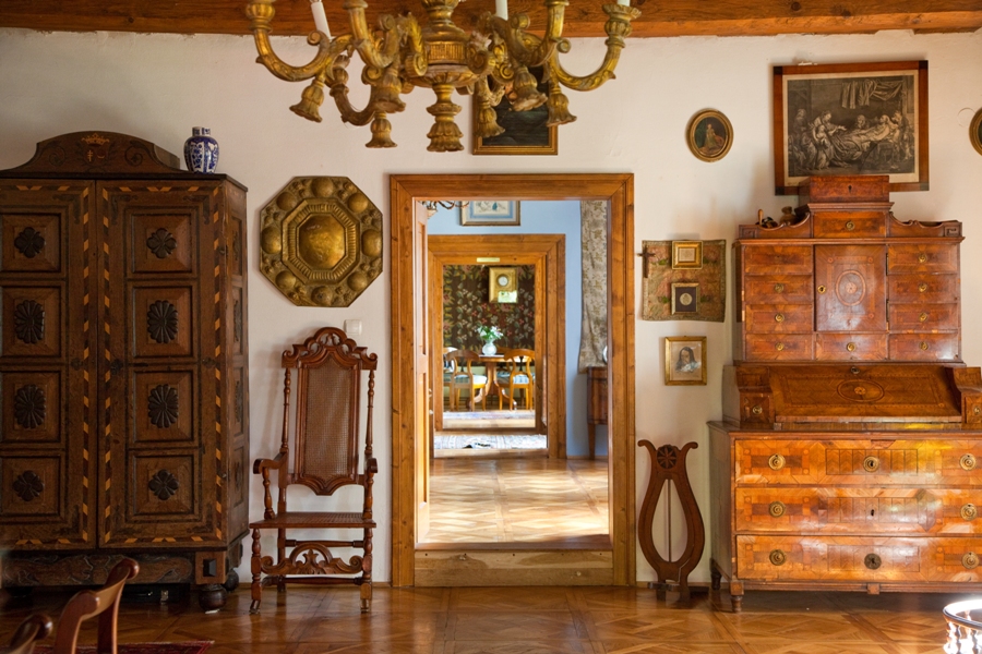 meble polskie z różnych epok: od baroku po biedermeier. Takie, jakie znajdowały się w wielu polskich dworach. Ozdobą kolekcji Andrzeja Kołdera jest szafa z XVIII wieku z herbami Pilawa i Łodzia – jeden z niewielu przykładów mebla sarmackiego.