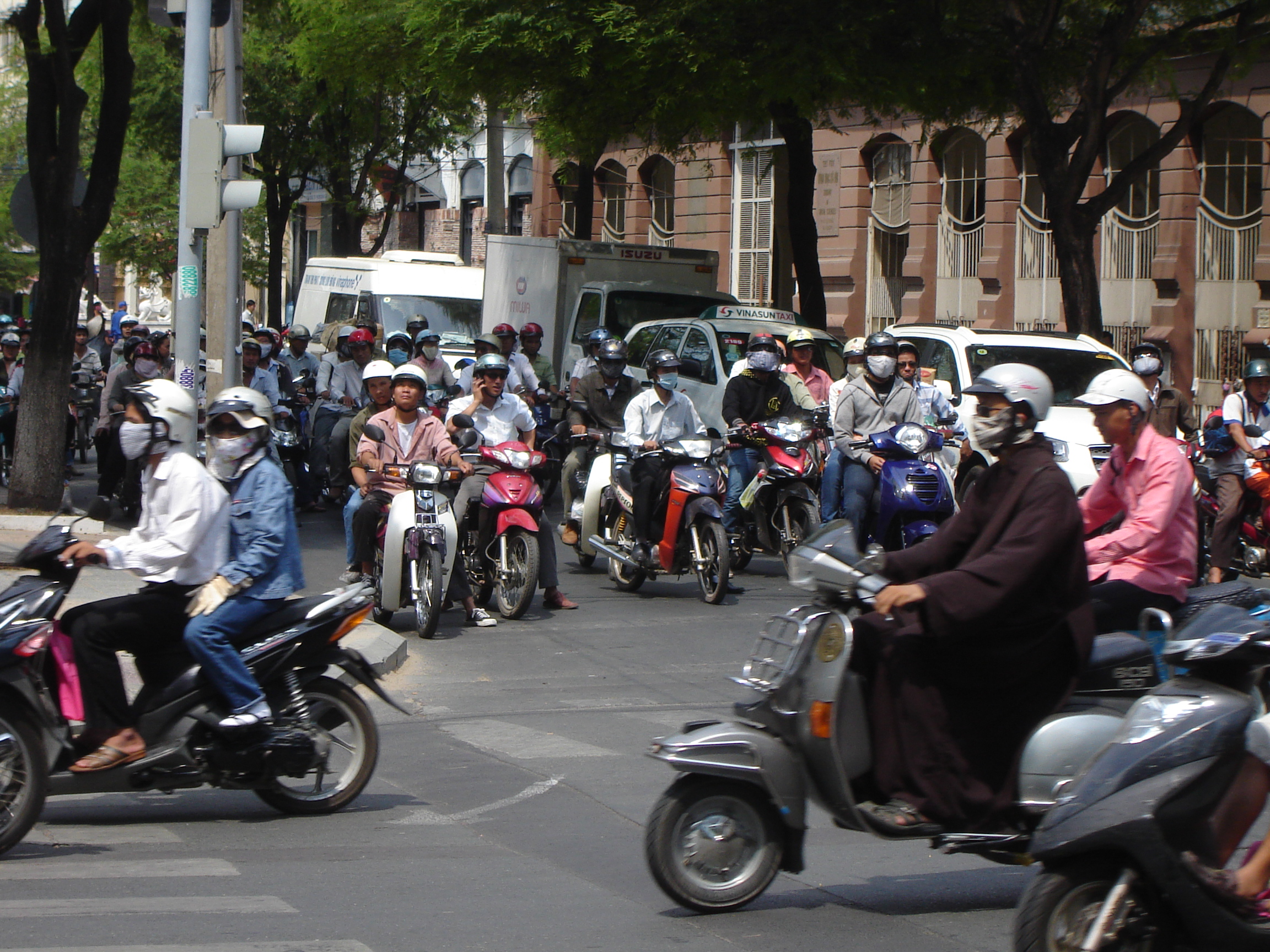 Wciąż pełno kontrastów. Po drugiej stronie ulicy można zjeść jeszcze taniej przy połatanym wózku ulicznego handlarza w spiczastym słomkowym kapeluszu, wyglądającego tak tradycyjnie i „wietnamsko”, że gdyby nie kilku akurat kupujących jedzenie krajanów oraz widok tysięcy podobnych handlarzy spotykanych także w odległych biednych dzielnicach, można by go wziąć za turystyczną atrakcję. Samo przejście na drugą stronę ulicy często może być niezłą, bardzo „wietnamską” przygodą. Po szerokiej jezdni mkną bez przerwy z jazgotem tysiące skuterów (szacuje się, że jest ich w Sajgonie 10 milionów), a prawie nigdzie nie ma przejść dla pieszych ani sygnalizacji świetlnej. Pozostaje wziąć głęboki oddech i śmiało wkroczyć na jezdnię pod koła pędzących maszyn, które nie zwalniają, ale w jakiś cudowny sposób omijają nas nie wpadając jednocześnie na siebie. Potem, po drugiej stronie możemy obetrzeć pot z czoła i westchnąć „ale Sajgon!”.