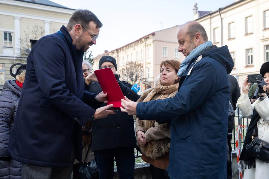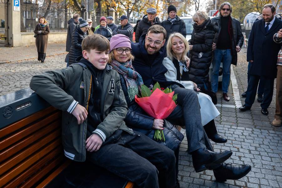 Rodzina śp. Janusza Majki na ławce solarnej Jego pamięci. Fot. Grzegorz Bukała/ Urząd Miasta Rzeszowa